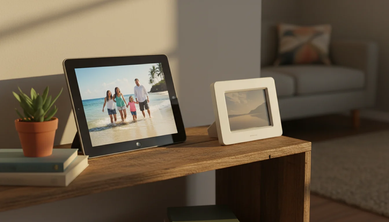 Cloud sync. Dedicated frames need their own app, their own account, and their own upload process. Your iPad already knows about iCloud or Google Photos. Set it to display a shared album and it updates automatically – new photos appear without anyone doing anything.