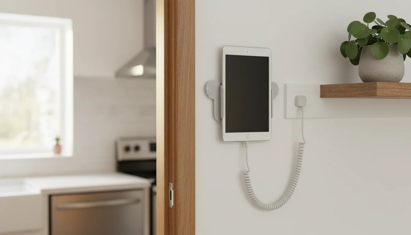 I have a Koala Mount on the wall next to the kitchen doorway, about eye level. An old iPad mini sits on it with a 6-foot (1.8 m) right-angle Lightning cable that runs down behind the door frame – basically invisible. The whole thing cost under $25, and it took about 20 minutes to set up.